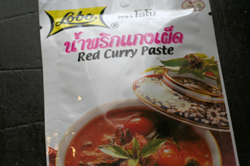 昨年、お隣さんがタイのお土産に現地のスーパーで買ってきたと言っていただいたものがあったはず、と探してみたら我が家にあったのはレッドカレーペーストでした。