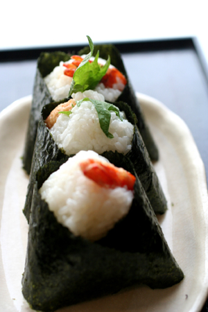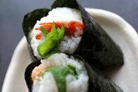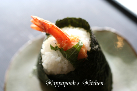 大葉と一緒にご飯で包むようにして握って、塩をして縦に切った海苔を着物のように巻きます。