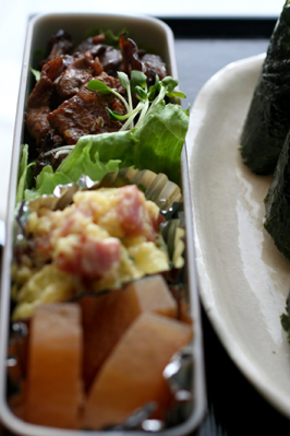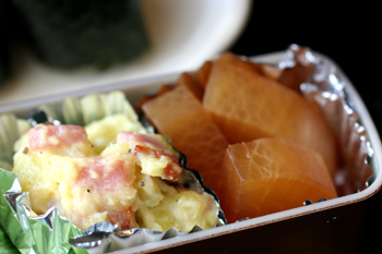 昨夜のぶり大根の大根だけ残っていていい具合に煮汁がしみこんでいたので、お弁当に入れました。