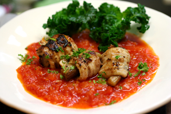 器に、トマトソースを敷き、あなごを盛り付け、パセリを散らして出来上がり。