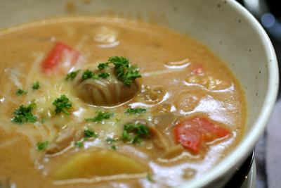 昨日のシチューの残りを温め直して、ごろごろの野菜の中からジャガイモ、ニンジン、マッシュルームを入れました。
