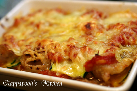 前日のトマトソースを使って、ズッキーニと、豚肉でラザニア風に重ねてオーブンで焼いてみました。