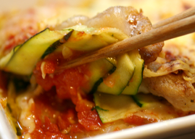耐熱容器に、ズッキーニ、豚肉、トマトソース、とろけるチーズ、と繰り返し重ねていきます。