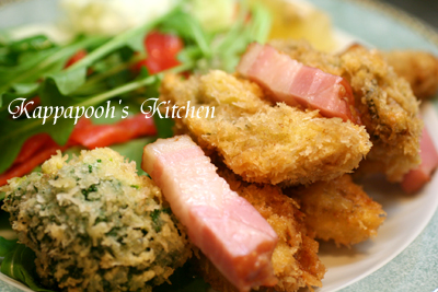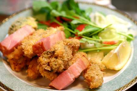 )牡蠣フライ、ブロッコリーのフライ、ベーコン、ルッコラ、レタス、スモークサーモンってね。