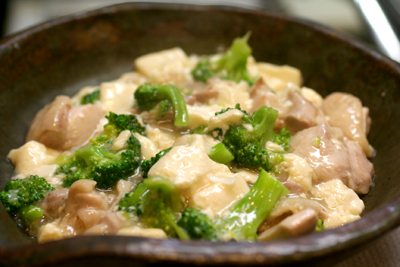 生姜とニンニクで鶏肉、豆腐、ゆでたブロッコリーを炒め、酒、鶏ガラスープ、塩・コショウで味付けしたものです。