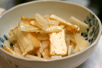 厚揚げはオーブントースターで加熱して適当な大きさに切り、細く切った大根と合わせて