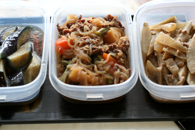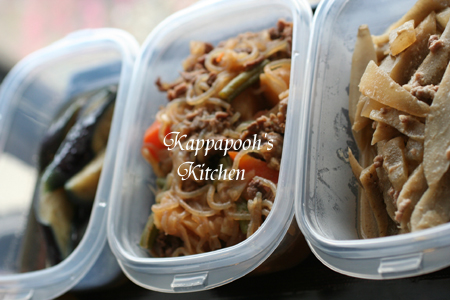 朝作った茄子の揚げびたしと、肉じゃが、ごぼうと大根のごま味噌煮。