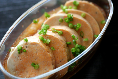 あん肝を、ラップで包んでゆでて冷ましたものを大根おろしとポン酢につけたもの。