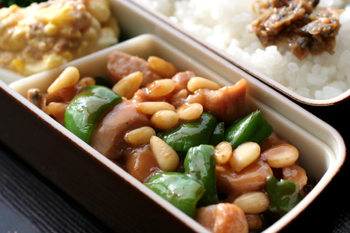 ピーマンと松の実を戻してさっと混ぜ合わせて、できあがり。