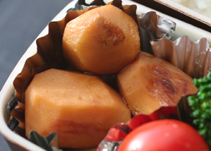 里芋は1個をいくつかに切り分けて、面取りして小芋のようにして煮ました。