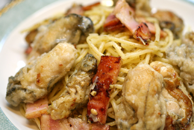 牡蠣は強力粉をまぶして、オリーブオイルでニンニクを炒めたフライパンにバターを加えてベーコンと共に、両面こんがり焼いて、パスタが茹で上がったら、ジェノバペーストで和えました。