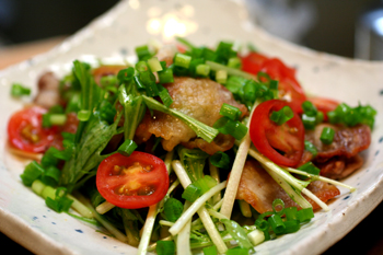 油を引かずに焼いて、塩ポン酢とラー油、塩・コショウで水菜と和えて。