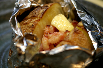 でも実際は皮ごとレンジで加熱して、切れ目を入れてベーコン、チーズ、を乗せてアルミホイルで包み、オーブントースターで焼き、バターを乗っけました。