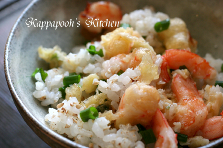 ご飯はすりごまとネギ、大葉でまぶしておき、かき揚げを乗せて岩塩をかけ、混ぜていただきました。