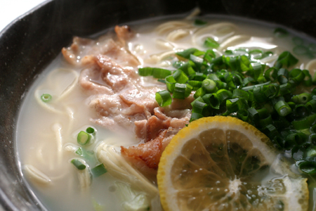 白ネギとニラをスープと一緒に煮込んで、きざみネギをちらし、焼いた豚肉を乗っけて、かぼすを