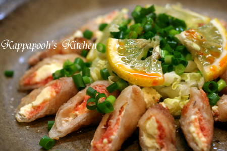 明太子とクリームチーズの組み合わせはお肉にあわせてカツにすることが多いのですが、今日は