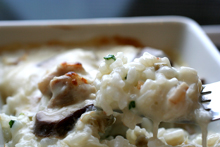 ご飯と混ぜ合わせて、耐熱容器に入れて、中華風鶏のクリーム煮をかけ、オーブントースターで