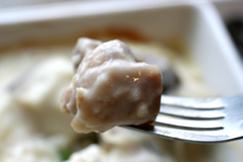 中華風鶏のクリーム煮を鍋から器に移して、鍋に牛乳を加え火にかけます。