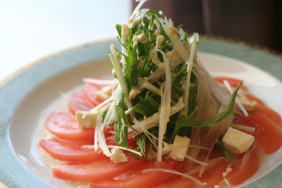 サラダは水菜、ミョウガ、クリームチーズ、白髪ネギです。