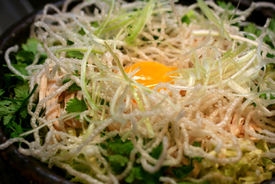 白菜の柔らかい部分、鶏胸肉を酒蒸しして裂いたもの、パクチー、春雨を揚げたもの、白髪ネギ