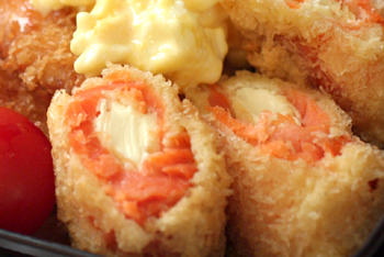 スモークサーモンでクリームチーズを巻いて衣をつけて揚げました。