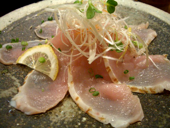 三河鶏の炙りたたき。塩ポン酢と柚子コショウでいただきます。
