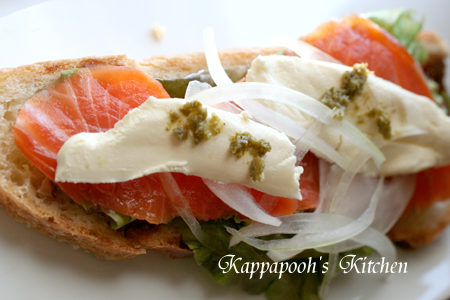 バターを塗って、レタス、スモークサーモン、オニオンスライス、クリームチーズを乗っけて、