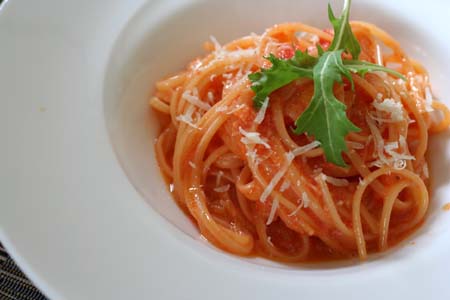 茹で上がったパスタを加えてさっと炒めて器に盛り付け、パルミジャーノチーズを散らして出来上がり。