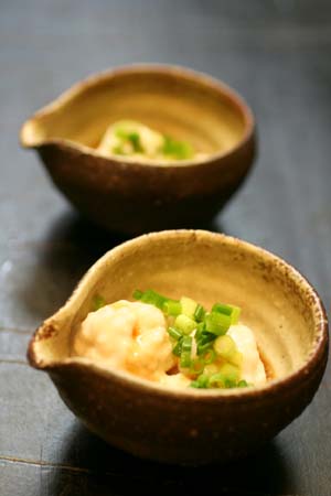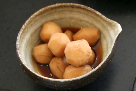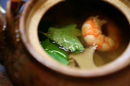 鍋にお酒を入れて、永谷園のお吸い物を入れて、エリンギを小さく松茸に見立てて入れ、海老、ゆり根を一緒に煮ました。