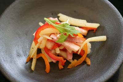 フライパンにオリーブオイルをひき、みじん切りしたにんにくと赤唐辛子を炒めたら、ベーコン、牛蒡を入れてさらに炒めます。