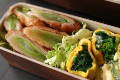 豚バラ肉で葱を巻いて、フライパンで油をひかずに焼いたら、酒、砂糖、醤油、生姜で甘辛く味付けしました。