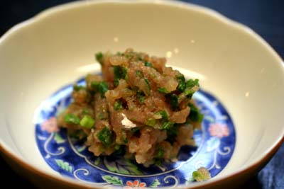 中華風なタレを作りました。にんにくを加えて酒、醤油、鶏がらスープの素、砂糖でタレを作って、切った煮貝の上からかけました。