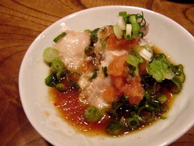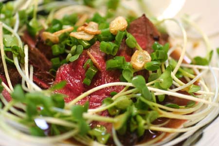 スライスした牛肉にカイワレ大根、きざみ葱を乗せて、ニンニクチップを散らし、からし入りポン酢をかけていただきます。
