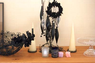 100円ショップで買ったキャンドルも一緒に飾って・・。ケーキスタンドも買ってきたものです。