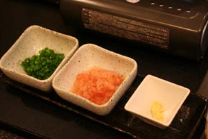 薬味は葱、もみじおろし、おろしニンニク。いつもはニンニクは用意しませんけど、翌日休みですからね。