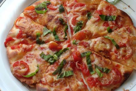 シンプルなピザが食べたいと夫が言ったので、トマト、チーズ、バジルのマルゲリータを作りました。