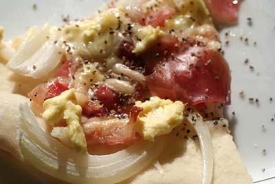 具は、今回は生ハムをつかって、生ハムは、トッピングして焼いたものと、出来上がりに生のまま乗せたもの。後は玉ねぎのみです。