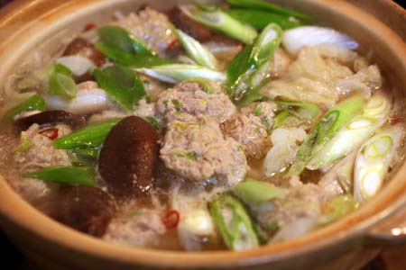 豚のひき肉と葱、卵、片栗粉、ごま油を練って団子を作って鍋に入れました。