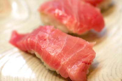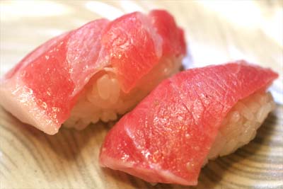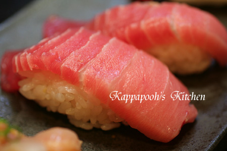 大トロと思われる柵はさすがに小さかったので、シャリも少なめにして小ぶりの握りです。