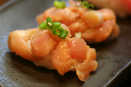 赤貝の貝ひもは、小さな軍艦巻きに。だんだんお腹が膨れてきたので、小さく握るようにして・・。