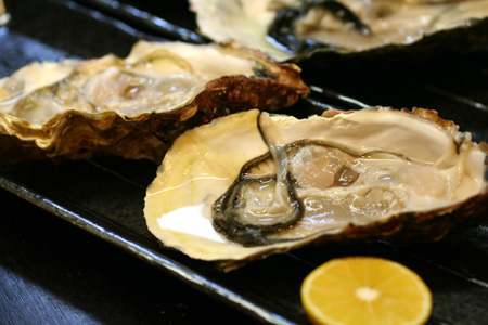 生牡蠣は1個150円。これを一人2個づつ。すだちを添えて。
