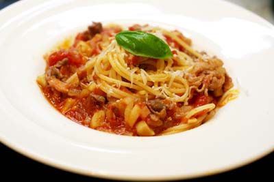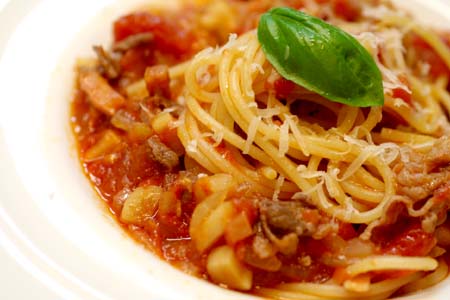 別のフライパンにオリーブオイルをひき、ニンニクと牛肉を炒めたら、これをトマトソースの鍋に入れて、塩・コショウ・パルミジャーノチーズで味を調えます。