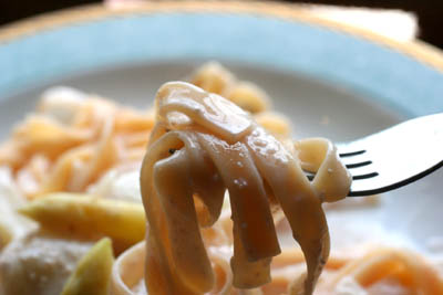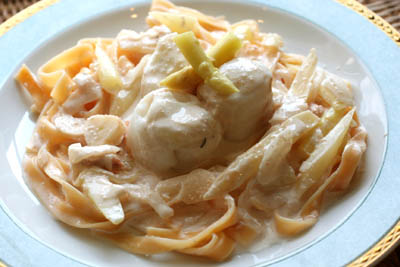茹で上がったパスタ(タリアテッレ)をソースに入れてさっと混ぜ合わせて、蒸した鱈とともに器に盛り付けて出来上がり。