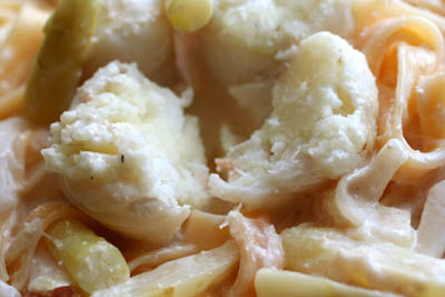 フライパンにオリーブオイルをひいて、ニンニク、玉ねぎの薄切りを炒め、ゆでて適当に切ったホワイトアスパラガス・明太子を加えて酒を入れて煮立たせます。