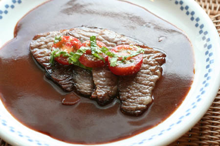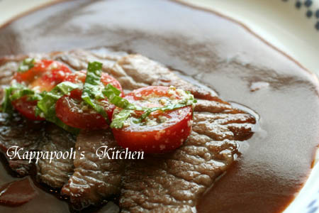 脂が多めの焼肉用の黒毛和牛をさっと焼いて、デミグラスソース、ウスターソース、醤油、赤ワインで煮込んだソースを肉汁と合わせてお肉にあわせました。