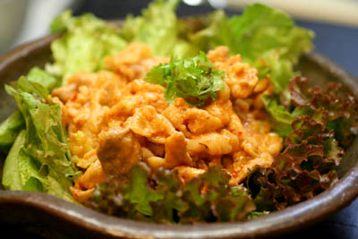 サニーレタスを敷き詰めたお皿に盛り付けパクチーを添えて出来上がり。