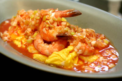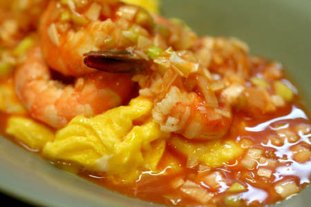 ふわっと焼いた卵を器に敷き、酒蒸しした海老を乗せて、チリソースにナンプラー、酒、白葱のみじん切りを加えたタレをかけて出来上がり。