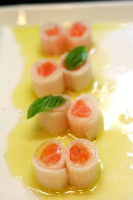 薄く剥いた大根に塩をしてしんなりさせて、さっと洗って水気をふき取り、生のサーモンを巻いて、オリーブオイル、レモン汁、クレイジーソルトを振り掛けました。
