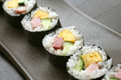 めずらしくベーコン入り海苔巻きにした朝食。酢めしにして巻きました。