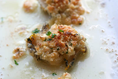 パン粉にパルメザンチーズ、みじん切りしたニンニク、パセリ、オリーブオイルを入れて混ぜ合わせ、つぶ貝の上に盛り付けます。